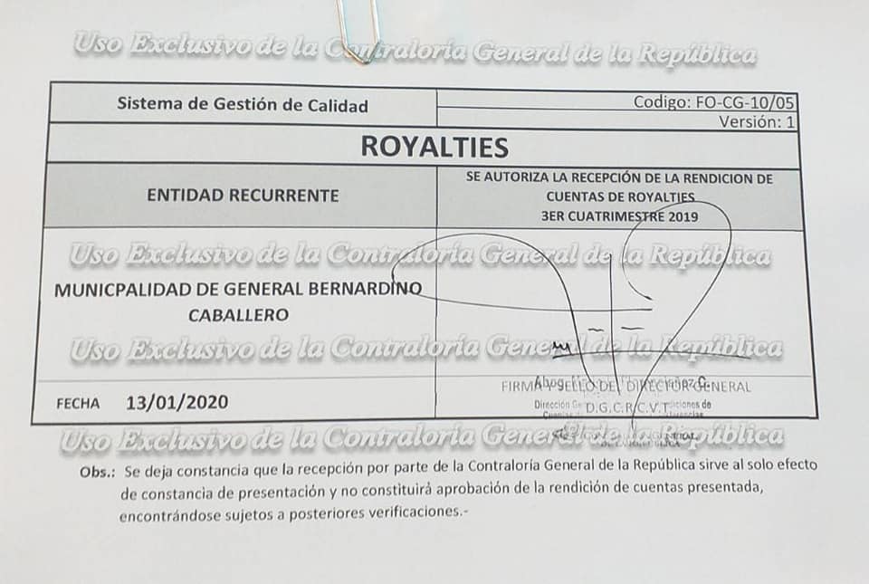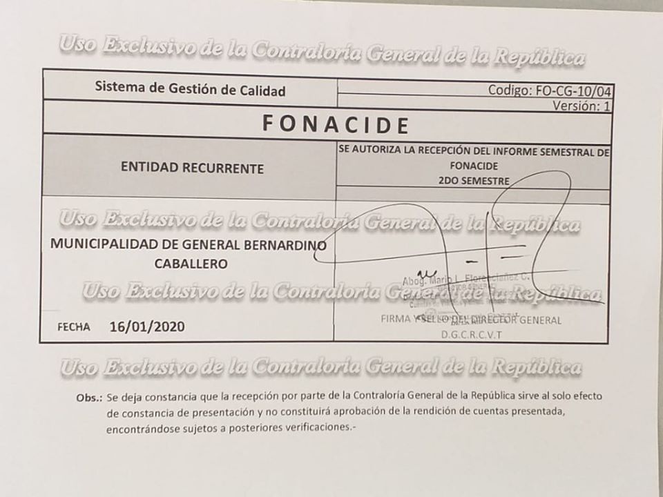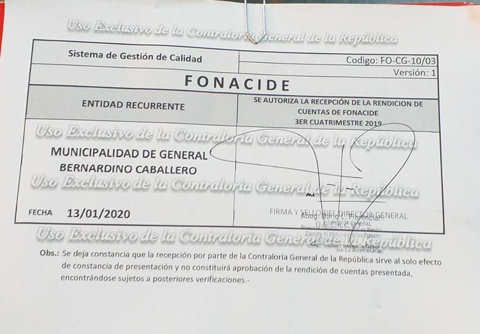 Rendición de Cuenta ante la CGR Posted on enero 14, 2020 by Administrador Administrador Presentación de informe semestral de los fondos de» FONACIDE «ante la Contraloría General de la República del ejercicio fiscal año 2019.